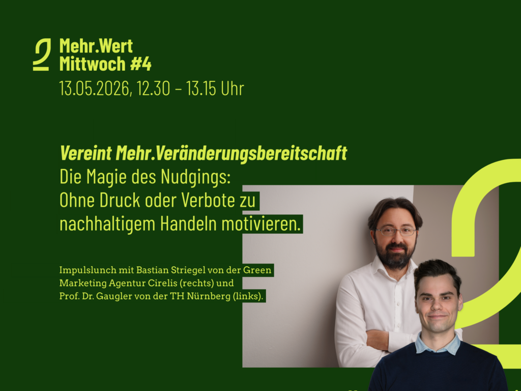 Ob es um nachhaltige Entscheidungen, die Implementierung neuer Prozesse im Unternehmen oder andere Transformationsthemen geht: Ohne die Bereitschaft der Zielgruppe läuft gar nichts. Und Ge- oder Verbote bringen einen nur bedingt weiter, was sicherlich jede:r Changeverantwortliche vom Elternteil bis zur Führungskraft schon erlebt hat. Was also tun? Beim Mehr.Wert-Mittwoch einwählen, zurücklehnen und sich folgende Impulse schmecken lassen: Prof. Gaugler unterrichtet und forscht an der TH Nürnberg zu der Frage, wie sich nachhaltige Veränderungen im Bereich Ernährung und Lebensmittelproduktion unter Berücksichtigung von Umwelt- und Sozialaspekten umsetzen lassen. In diesem Kontext bringt er uns Learning-Impulse aus seinen aktuellen Nudging-Projekten mit. Als Sahnehäubchen dieses Sternemenüs kredenzt uns Bastian Striegel, Green-Marketing-Spezialist von Cirelis, inspirierende Nudging-Impulse und Live-Experimente. Es gibt also diesmal nicht nur einiges aufzusaugen und zu diskutieren, sondern auch vieles selbst zu erleben.