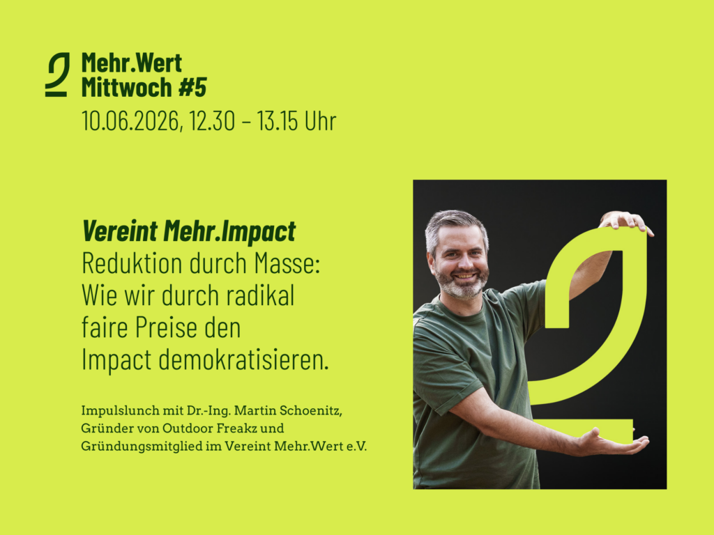 Prof. Dr. Matthias Finkbeiner, Miterfinder des Mehr.Wert-Ansatzes, nimmt uns mit auf eine Reise hinein in den wissenschaftlichen Background des Mehr.Wert-Standards. Erfahrt beim gemütlichen virtuellen Lunch, wie die Monetarisierung von Umweltauswirkungen und Wiedergutmachungsleistungen nach Mehr.Wert-Standard genau funktioniert, welche interdisziplinären Methoden dahinterliegen und warum es sich für Unternehmen lohnt, genau auf diesen Ansatz zu setzen, um langfristig erfolgreich zu bleiben.
